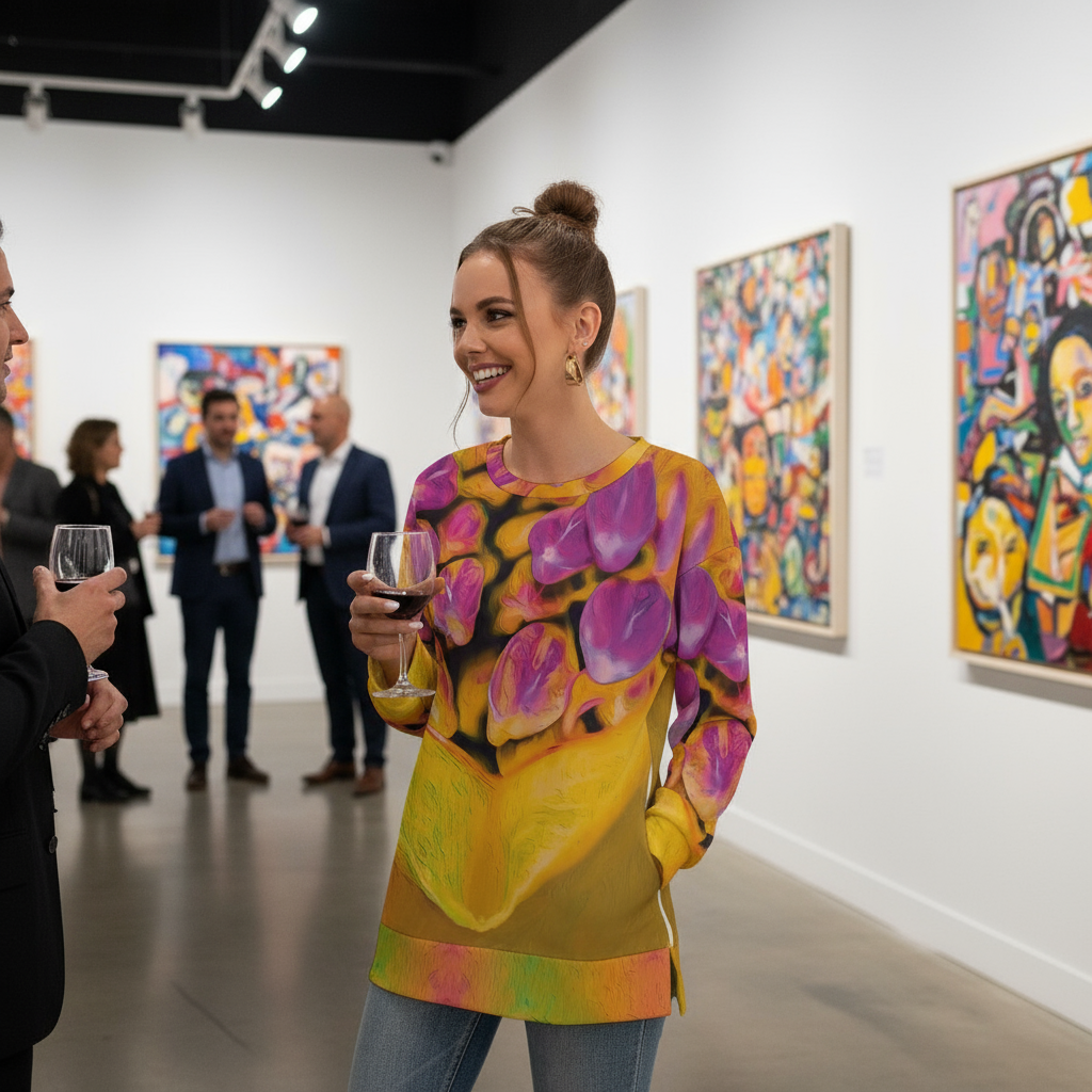 This stunning abstract image showcases bright and vibrant Agapanthus buds bursting from a floral core, creating a captivating and colourful visual experience that inspires creativity. Classic round neck women's long-sleeved t-shirt, the slit design at the bottom of the side is the highlight of this sweatshirt.