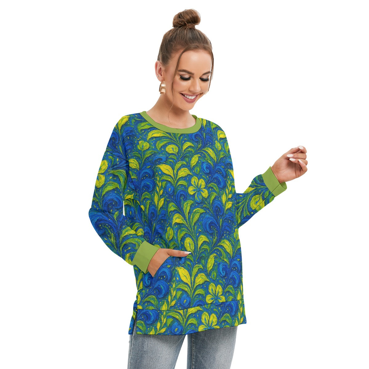 “ Cobalt Meadow” Women's Side Split O-neck Sweatshirt