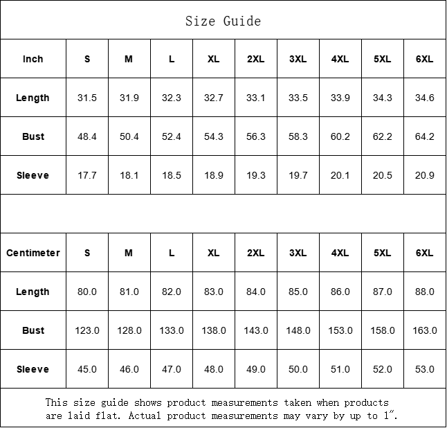 | Centimeter | S | M | L | XL | 2XL | 3XL | 4XL | 5XL | 6XL |