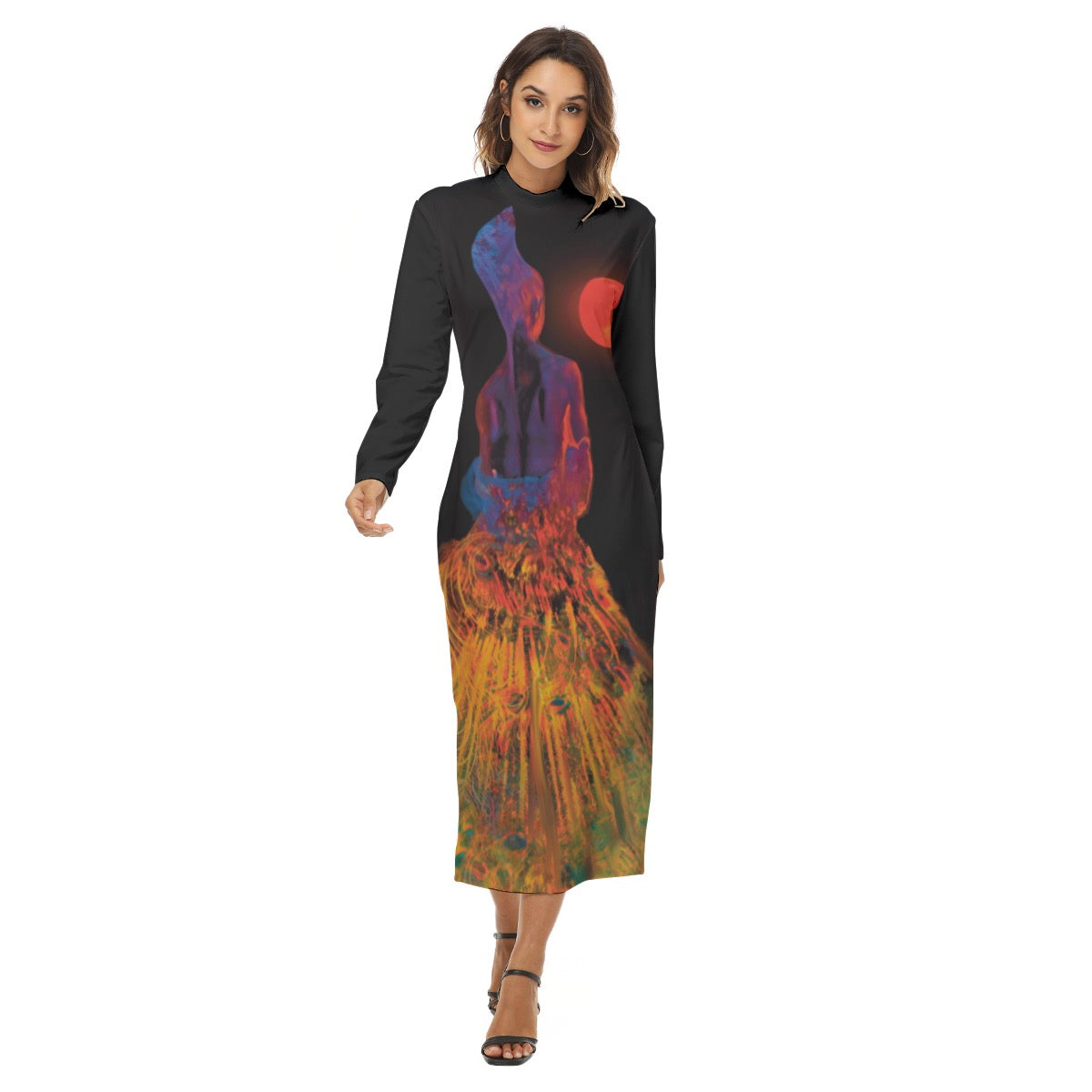 This artwork features a human silhouette with an ethereal peacock gown, set against a striking red moon, evoking emotions of mystery, beauty, and the connection to nature.Sexy close-fitting hip skirt with zipper opening and closing, both sides can be worn as the front, you can mix and match at will