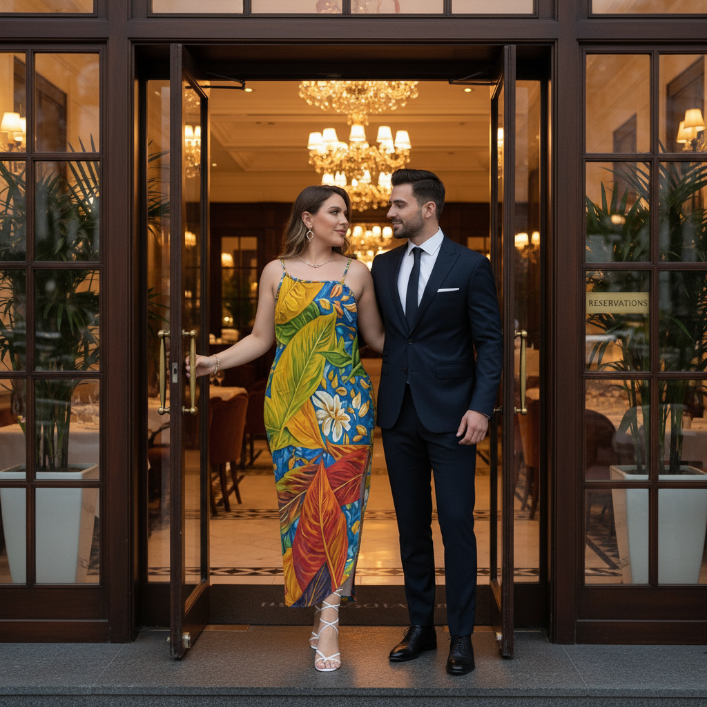 “Botanical Rhapsody” All-Over Print Women's Oblique-Shoulder Exposure Dress With Side Split