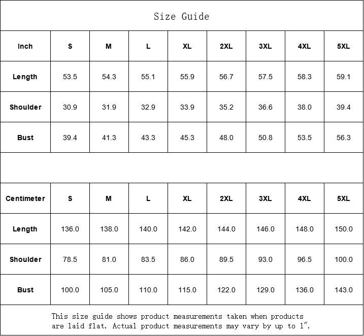 | Centimeter | S | M | L | XL | 2XL | 3XL | 4XL | 5XL |