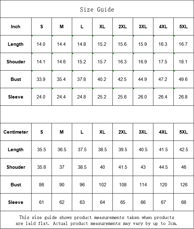 | Centimeter | S | M | L | XL | 2XL | 3XL | 4XL | 5XL |