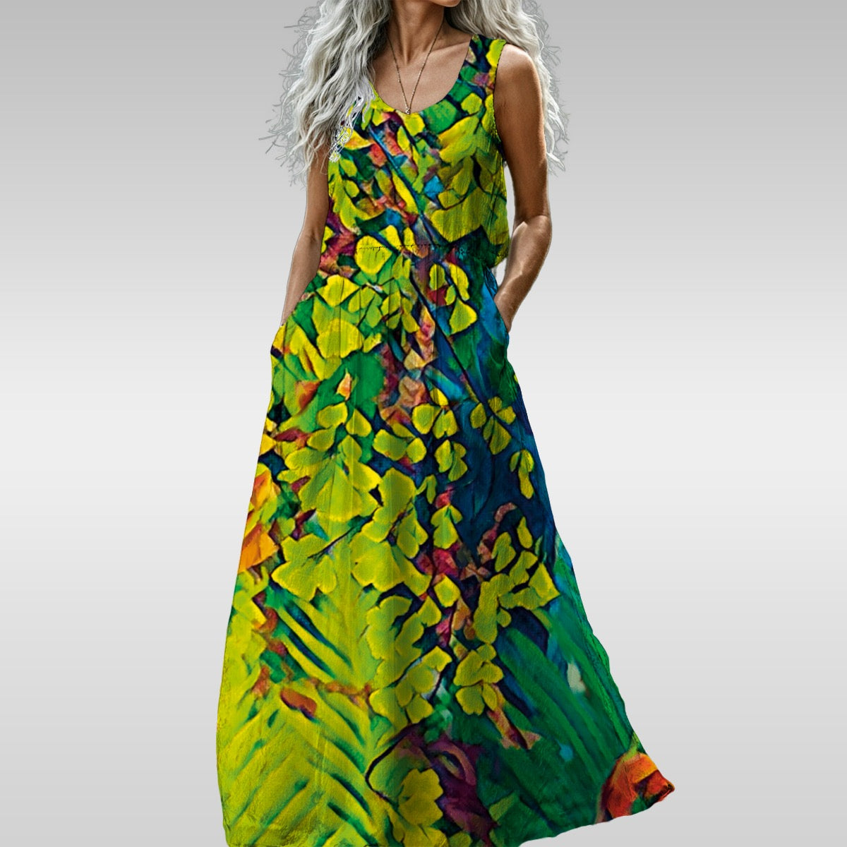 This sleeveless maxi dress is made from lightweight 140G polyester fabric, offering a smooth, breathable feel that's ideal for spring and summer. The design features a fitted bodice with a high waistline and a gently flared hem, creating a flattering silhouette with graceful flow. The blue-toned tropical leaf print adds a vibrant, refreshing touch, making this dress perfect for casual outings, vacations, beach walks, or garden parties.