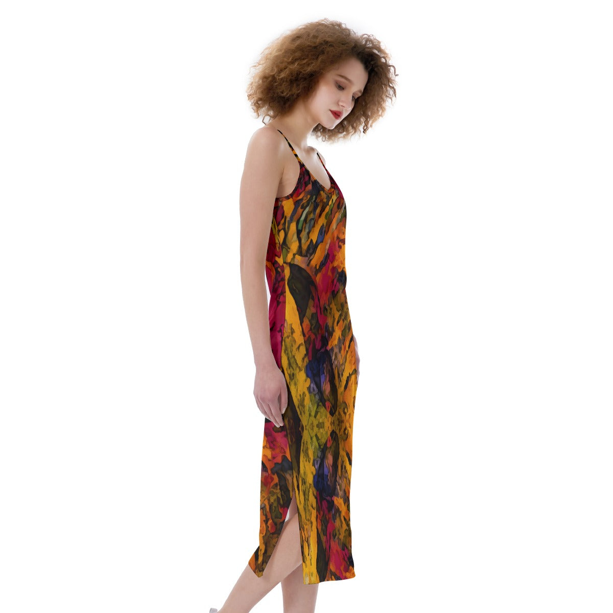 - With spaghetti straps, side slit.