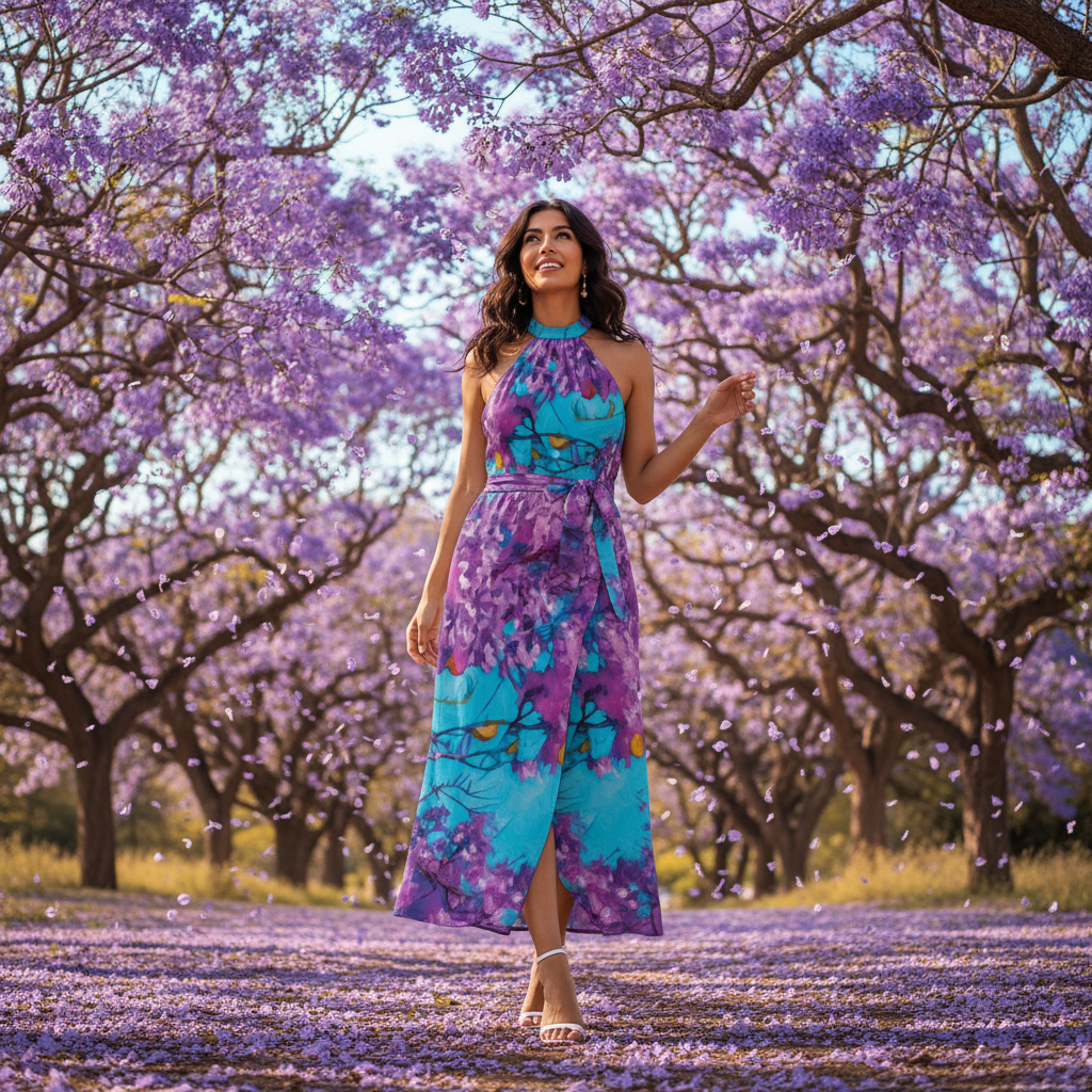 “Jacaranda Season” (Cobalt) Women's Wrap Hem Belted Halter Dress