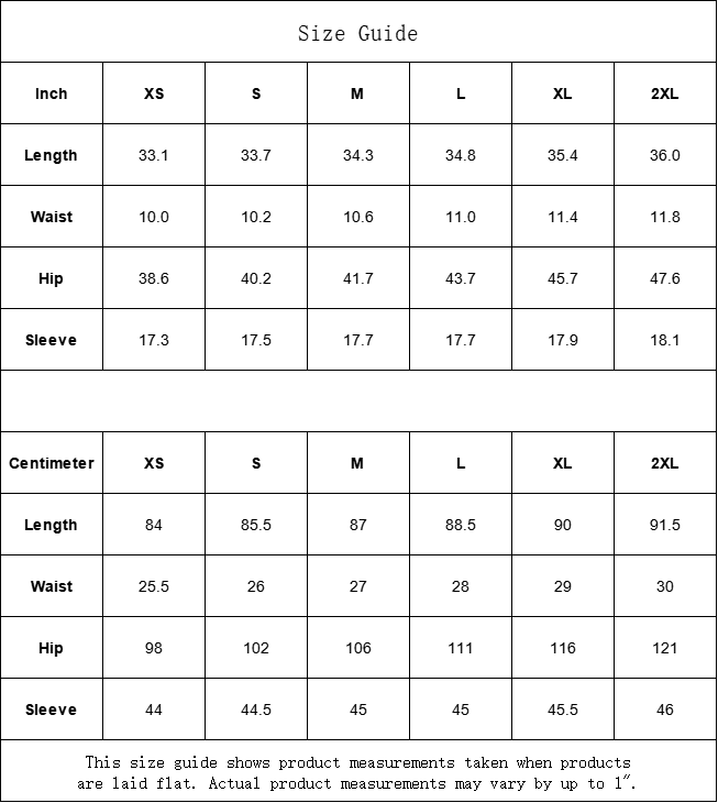 | Sleeve | 44 | 44.5 | 45 | 45 | 45.5 | 46 |