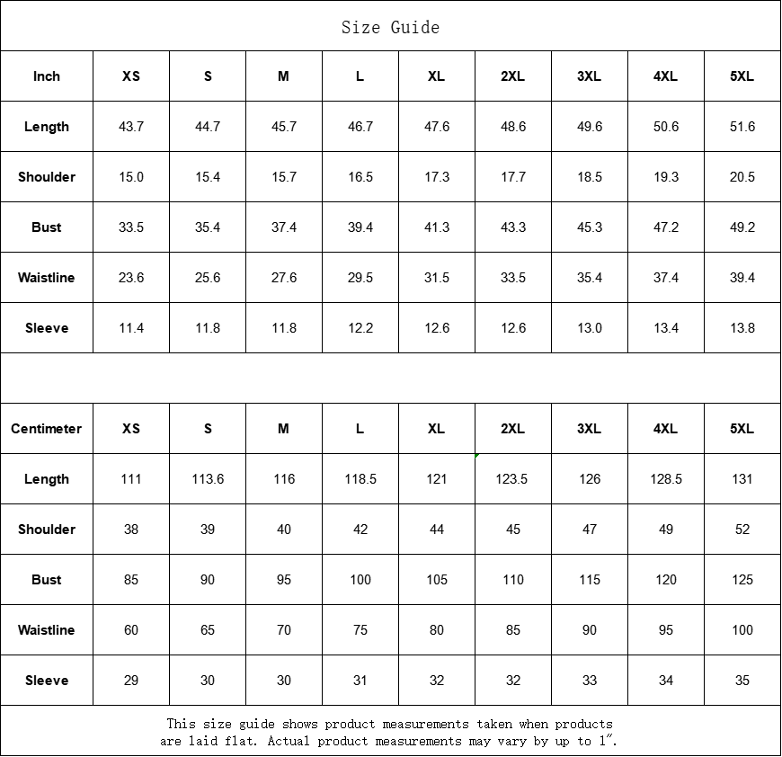| Centimeter | XS | S | M | L | XL | 2XL | 3XL | 4XL | 5XL |