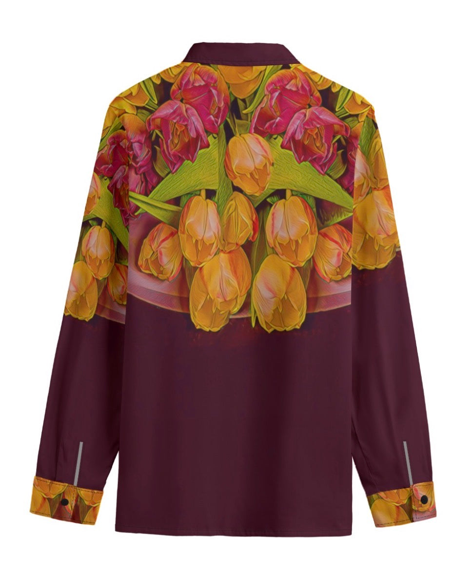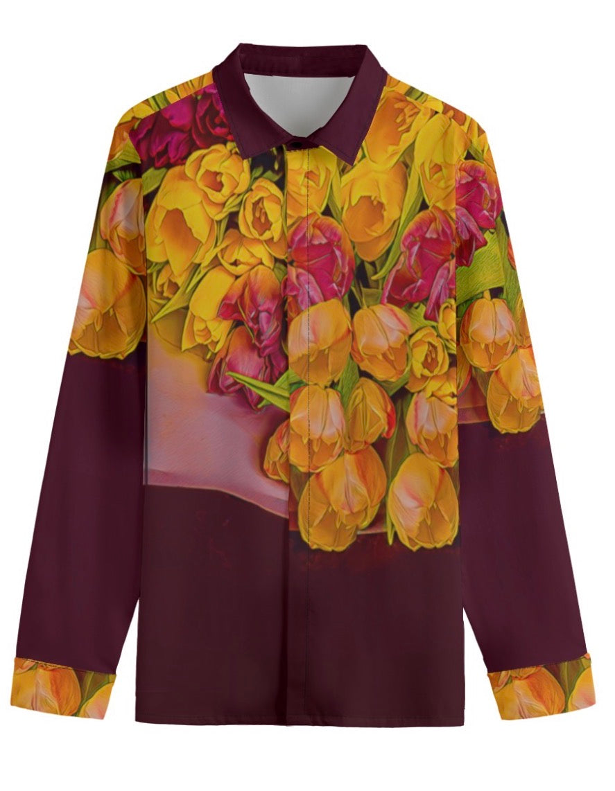 - Lapel collar, long sleeve, concealed placket, button closure