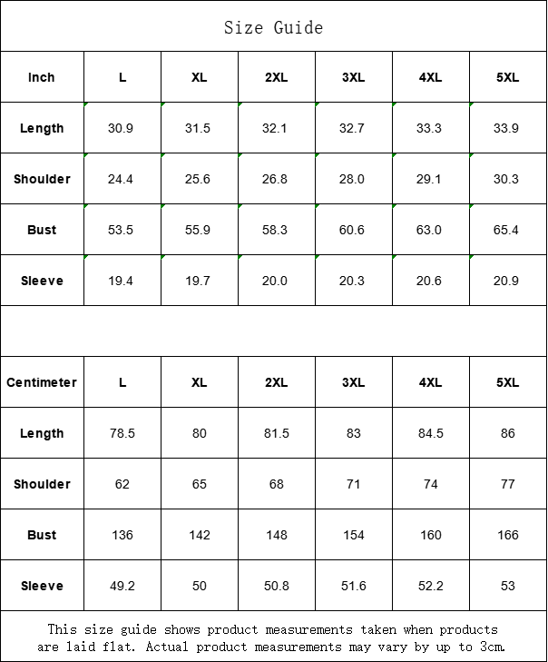 Inch | L | XL | 2XL | 3XL | 4XL | 5XL |