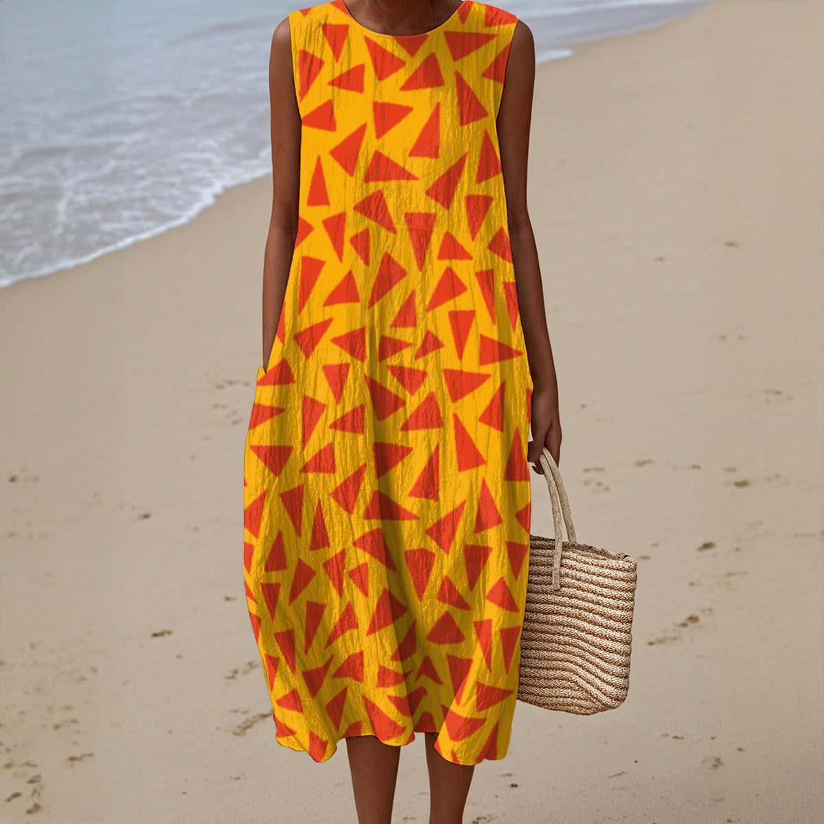 Are you ready to infuse your wardrobe with a burst of sunshine and a dash of daring? Then look no further! This isn't just a dress; it's a statement. Picture yourself strolling along the beach, the golden sand mirroring the vibrant yellow backdrop of this beauty. The playful scatter of Tangerine triangles isn't just a print; it's a rhythm, a dance of geometric joy that moves with you.