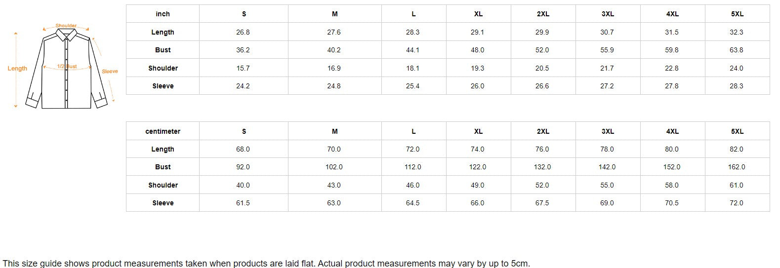| inch | S | M | L | XL | 2XL | 3XL | 4XL | 5XL |