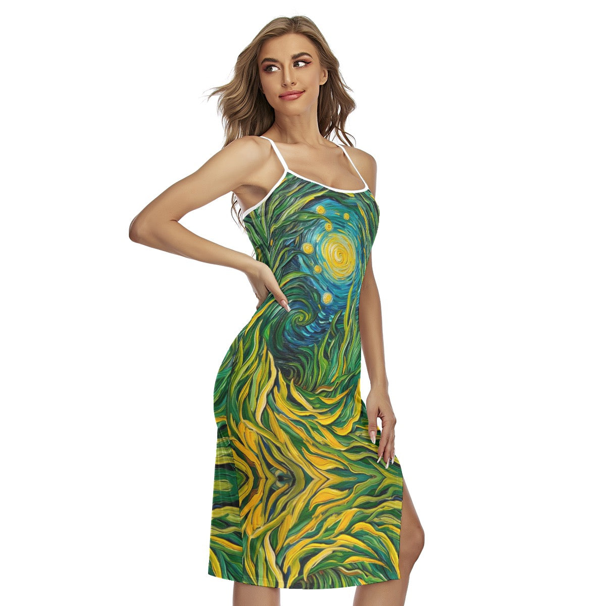 - Spaghetti straps, cross back tie, side split